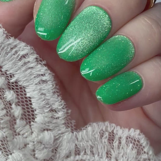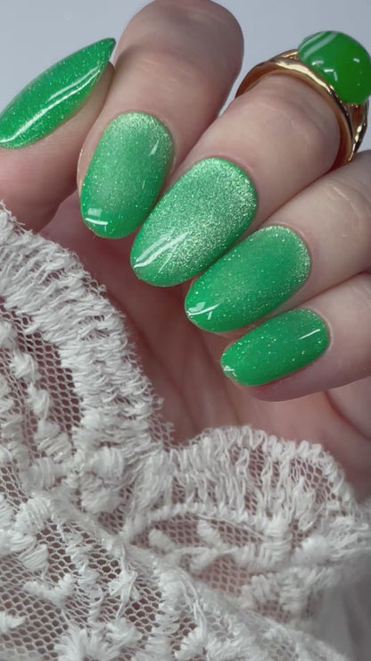 "Charmed," the verdant enchantress of the nail polish realm! This lively green Cat Eye gel polish dances with the mischievous spirit of an emerald sprite, casting a spell of vibrant allure on your fingertips. Let your nails become the canvas for this whimsical hue, as "Charmed" weaves a tale of playful elegance.