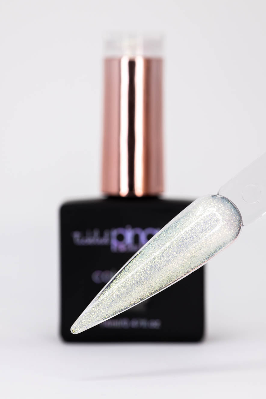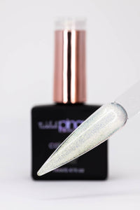"Elysium" is an enchanting gel polish that transcends the ordinary. Let your nails sparkle with the subtle glamour of a fairy's dust, as if you've captured stardust in a bottle. This sheer shimmering ethereal white is kissed by a delicate hint of gold, like a dance of moonlight on freshly fallen snow. Transform your fingertips into enchanted whispers of moonlit elegance, as the glistening gold dust dances across the pearly canvas.