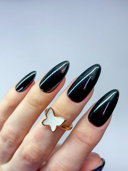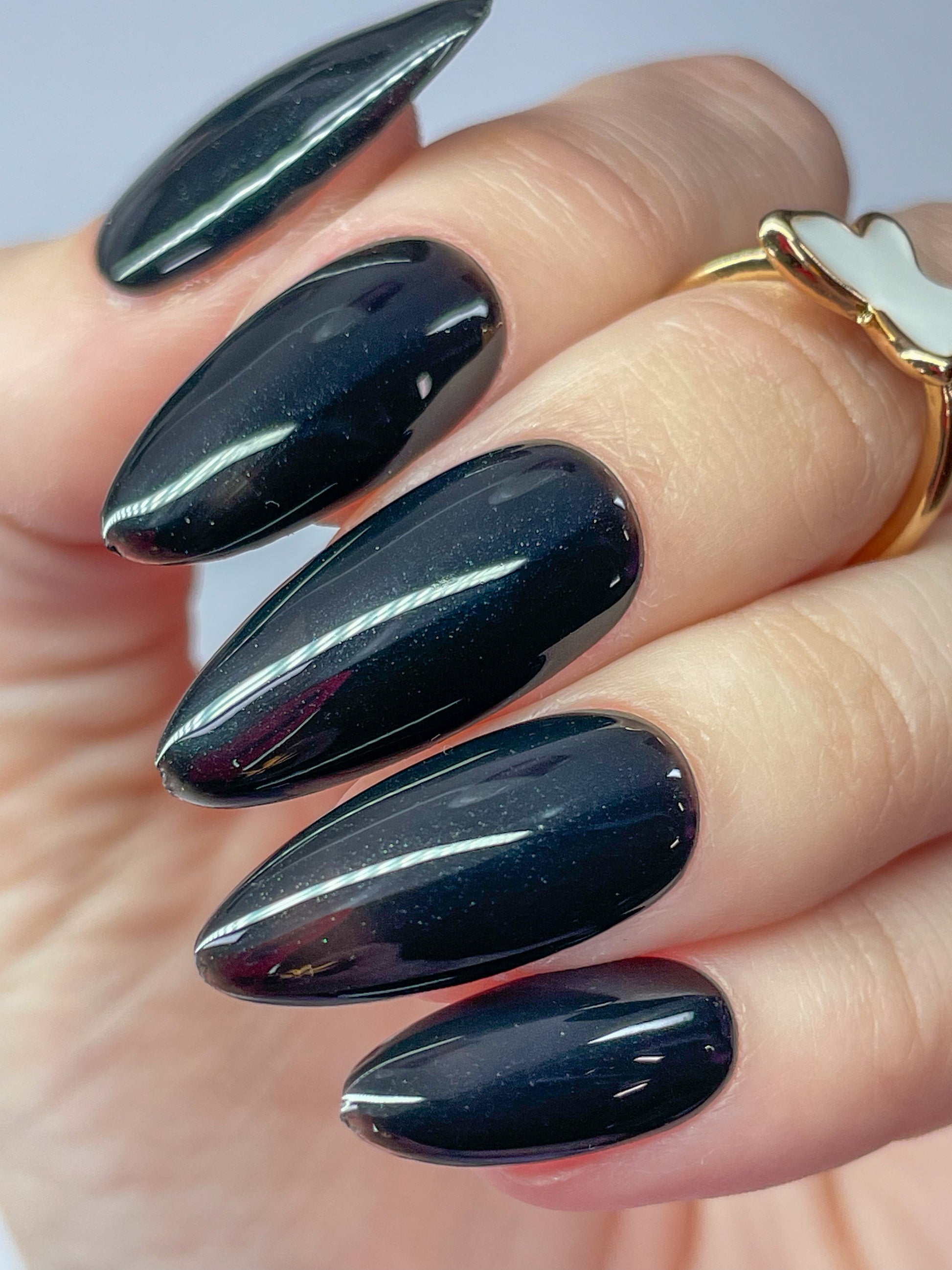 "Coal Under Pressure," the clandestine charm in a bottle! This black shimmer gel polish is like a midnight rendezvous for your nails, where elegance meets intrigue. Picture a moonlit sky filled with mysterious allure – that's the essence captured in every smooth application of this enigmatic hue. Dive into the depths of sophistication as "Coal Under Pressure" adds a touch of mystique to your nails, ensuring your manicure is anything but ordinary. Let your style speak volumes with this bewitching shade that effortlessly commands attention.
