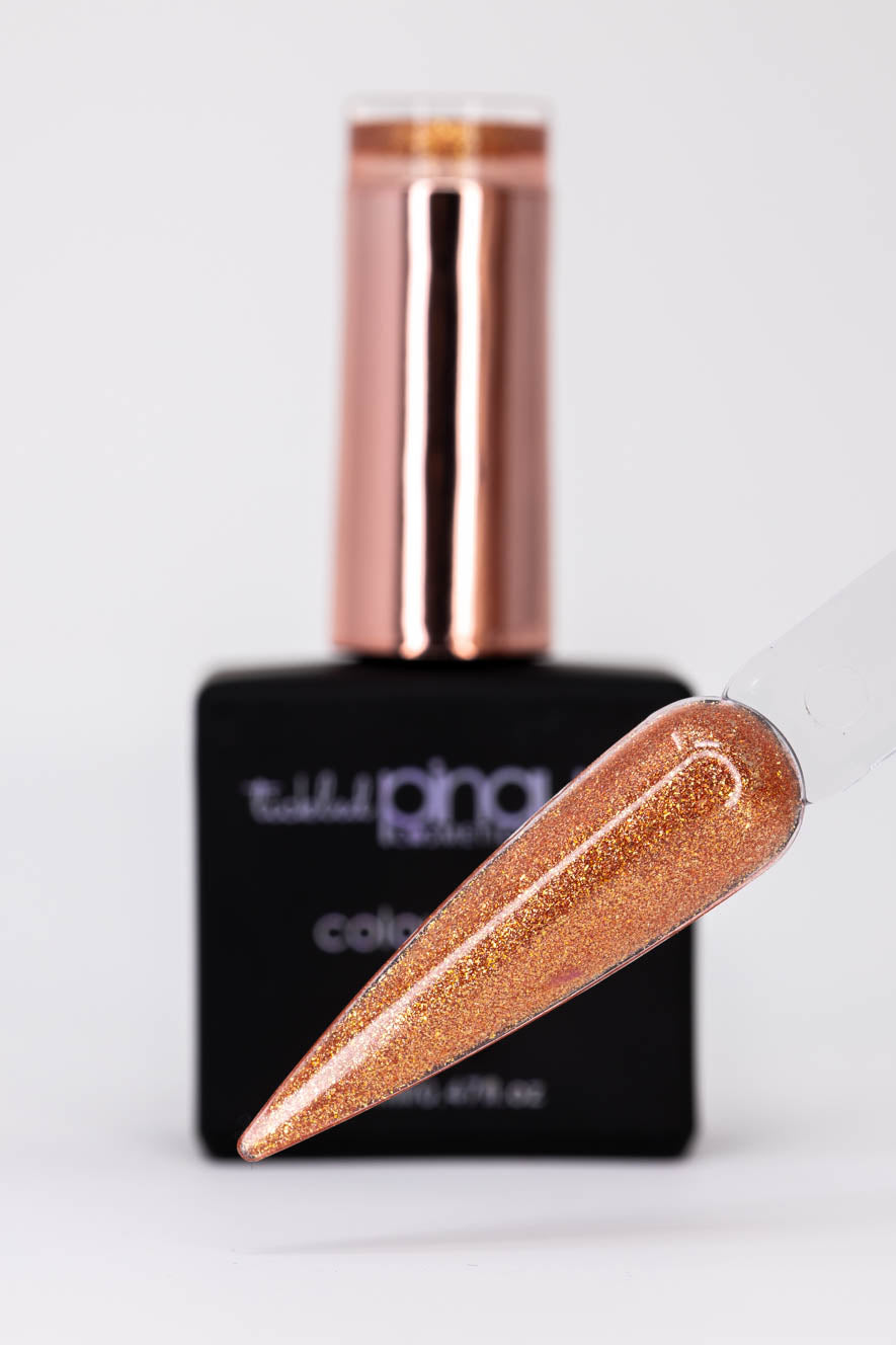 Step into the dazzling world of "Gold Mine," where your fingertips become a playground of pure radiance. This copper glitter gel polish is a fusion of molten magic and shimmering elegance, giving your nails an enchanting allure that's impossible to ignore. Picture a cascade of golden sparks dancing across your nails, creating a lustrous landscape that captures the essence of playful sophistication. Your nails become a treasure trove of glistening wonder, as if you've unearthed a secret stash of glamour.
