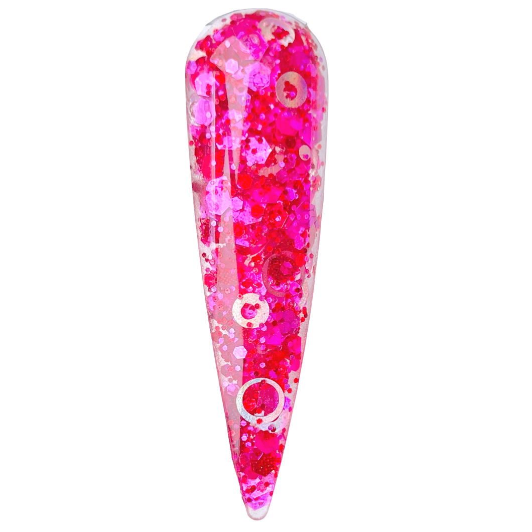 "Circle Of Trust" is a sultry blend of red, magenta glitters with a touch of silver circles that adorn your nails like tiny tokens of affection. Like love itself, each circle intertwines with the next, creating a symphony of color that's both bold and beautiful. Red, the color of passion, mingles with magenta, adding a touch of mystery, while silver brings a touch of elegance to this enchanting mix. Apply "Circle of Trust" with a wink and a smile, and watch as heads turn, hearts flutter, and compliments flow. Love is in the air, and now, it's at your fingertips – literally!