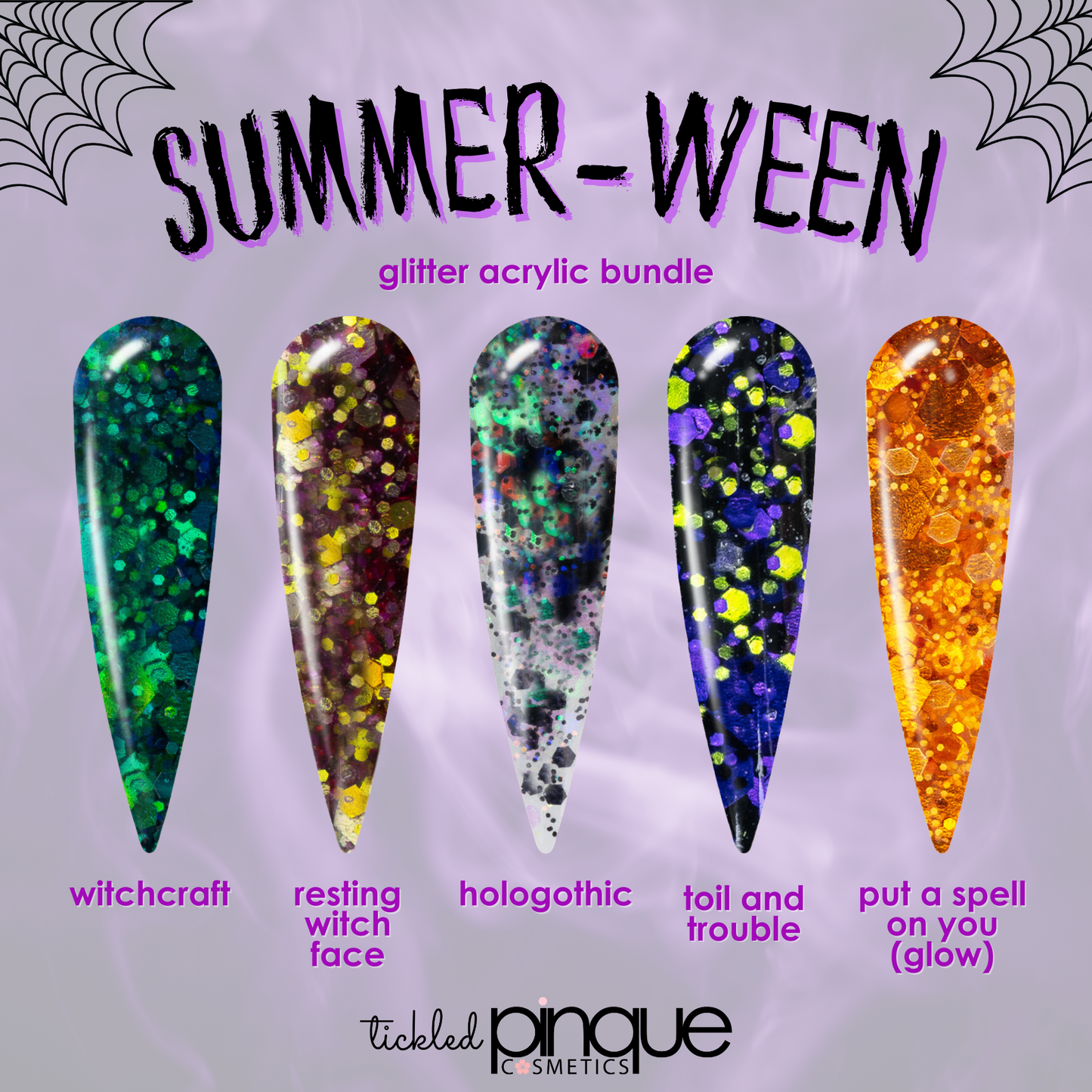 Get ready to conjure up some magical summer vibes with Tickled Pinque Cosmetics' enchanting Summerween Acrylic Bundle! These spellbinding shades are perfect for adding a touch of witchy glam to your summer nights. Embrace the whimsical fusion of Halloween spookiness and sunny summer fun with these bewitching acrylic colours: