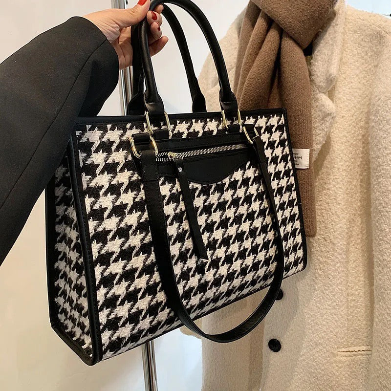 The Pinque Street Tote is where classic pattern meets modern edge. Designed with a striking houndstooth-inspired print and a structured, boxy silhouette, this tote delivers effortless street-style sophistication with a refined finish.